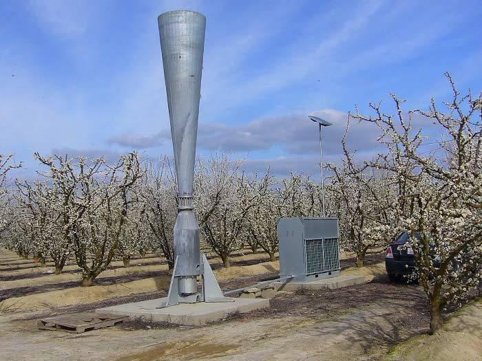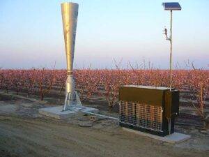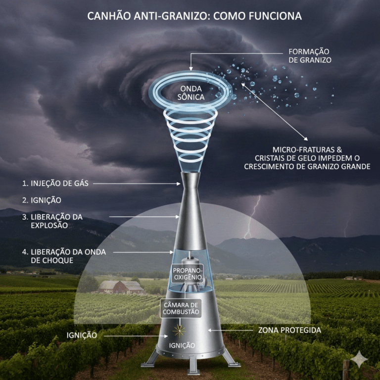 Frequência de Disparos: Para manter essa área protegida, o canhão precisa disparar repetidamente (geralmente a cada 4 a 7 segundos) para garantir que a pressão atmosférica naquela “bolha” de 100 hectares permaneça hostil à formação de granizo sólido.