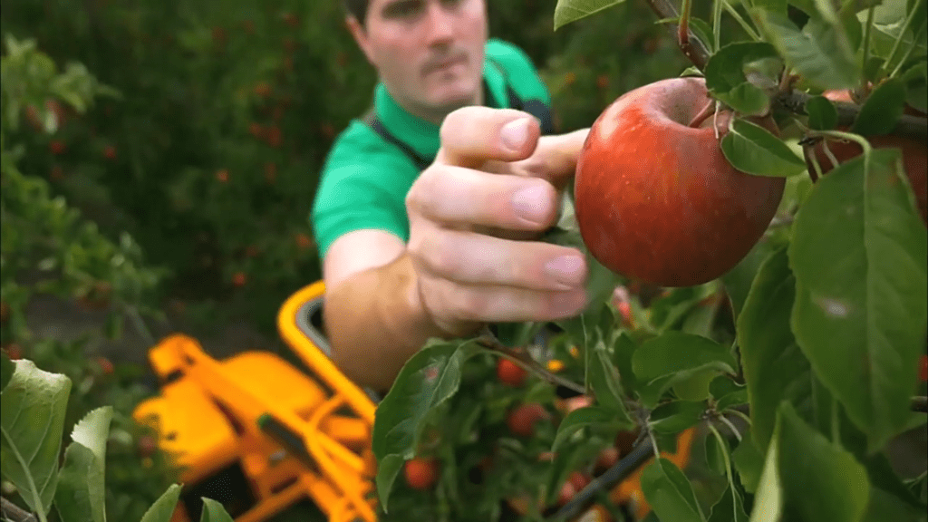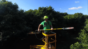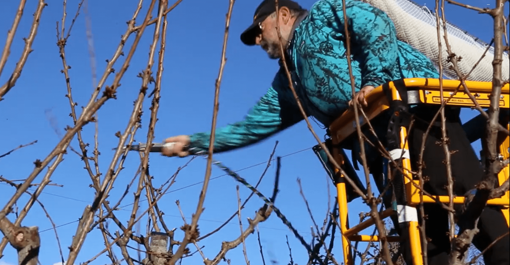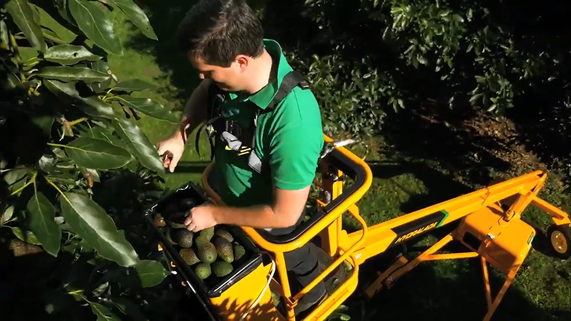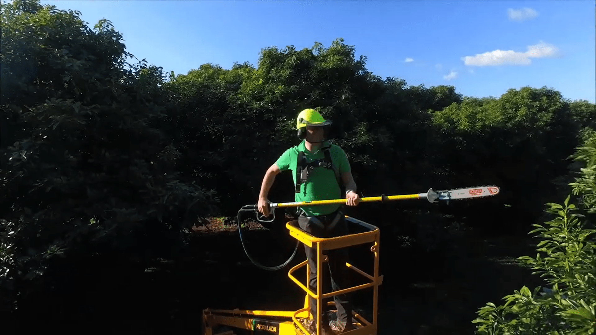Para a colheita de frutas, poda de árvores e manutenção da rede aérea de proteção de colheitas.